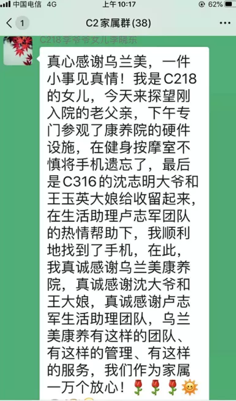 考慮到失主丟失財物焦急的心情,沈爺爺用餐過后便立即回到房間,正打算挨家挨戶找尋失主時,碰到了前來尋找手機(jī)的C區(qū)二樓生活助理團(tuán)隊(duì)們。“真的特別謝謝大家的熱心幫助,當(dāng)烏蘭美的護(hù)士和生活助理人員知道我的手機(jī)丟失后,都自發(fā)的幫我找尋手機(jī)。我真的感到特別的暖心,特別的貼心。經(jīng)過這次事情,我對我老父親住在這里一萬個放心!因?yàn)檫@里的工作人員不僅細(xì)心呵護(hù)、照顧老人,還守護(hù)了他們的財產(chǎn)安全。”